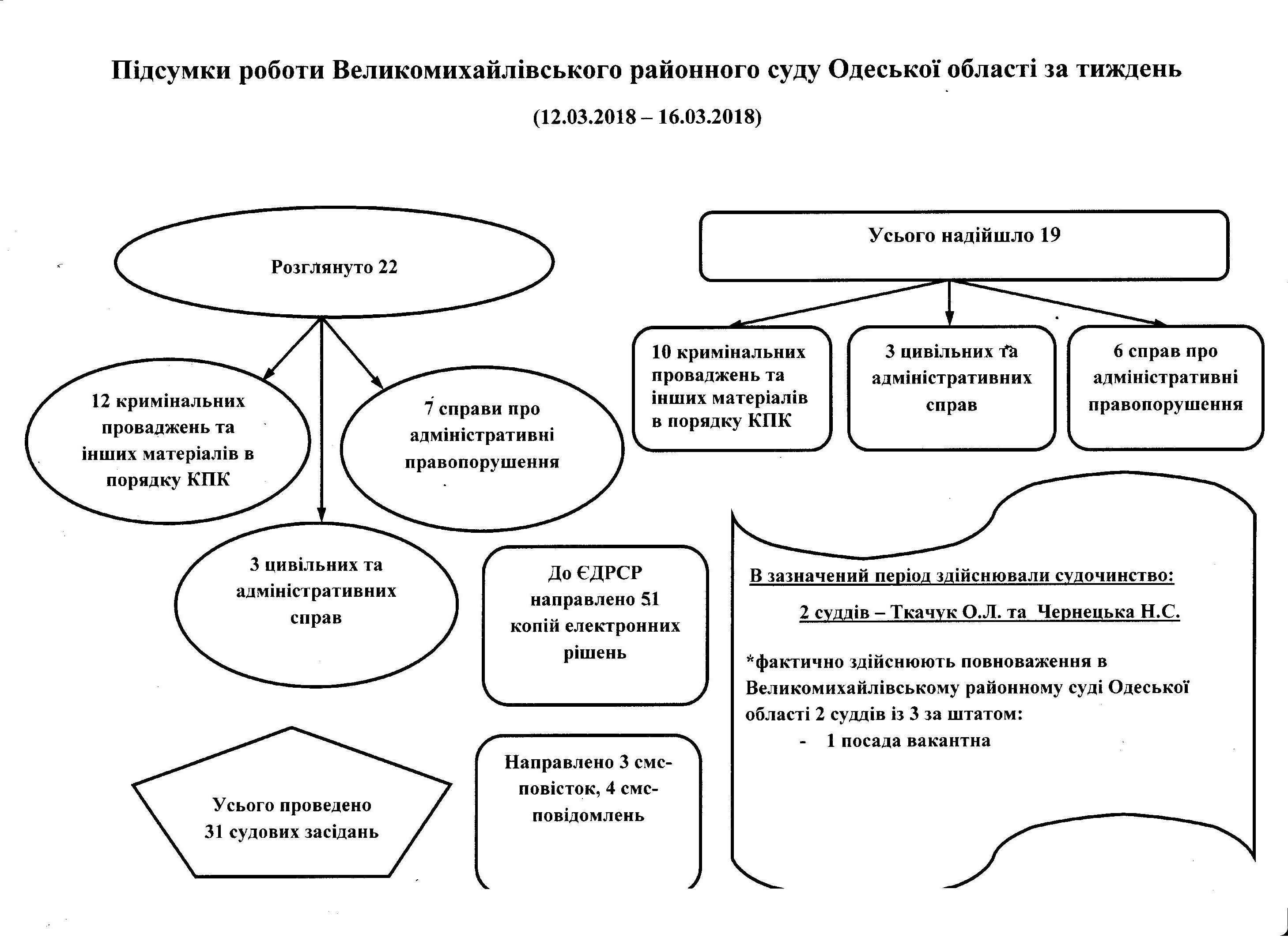 Підсумки роботи Великомихайлівського районного суду Одеської області за тиждень (12.03.2018 - 16.03.2018
